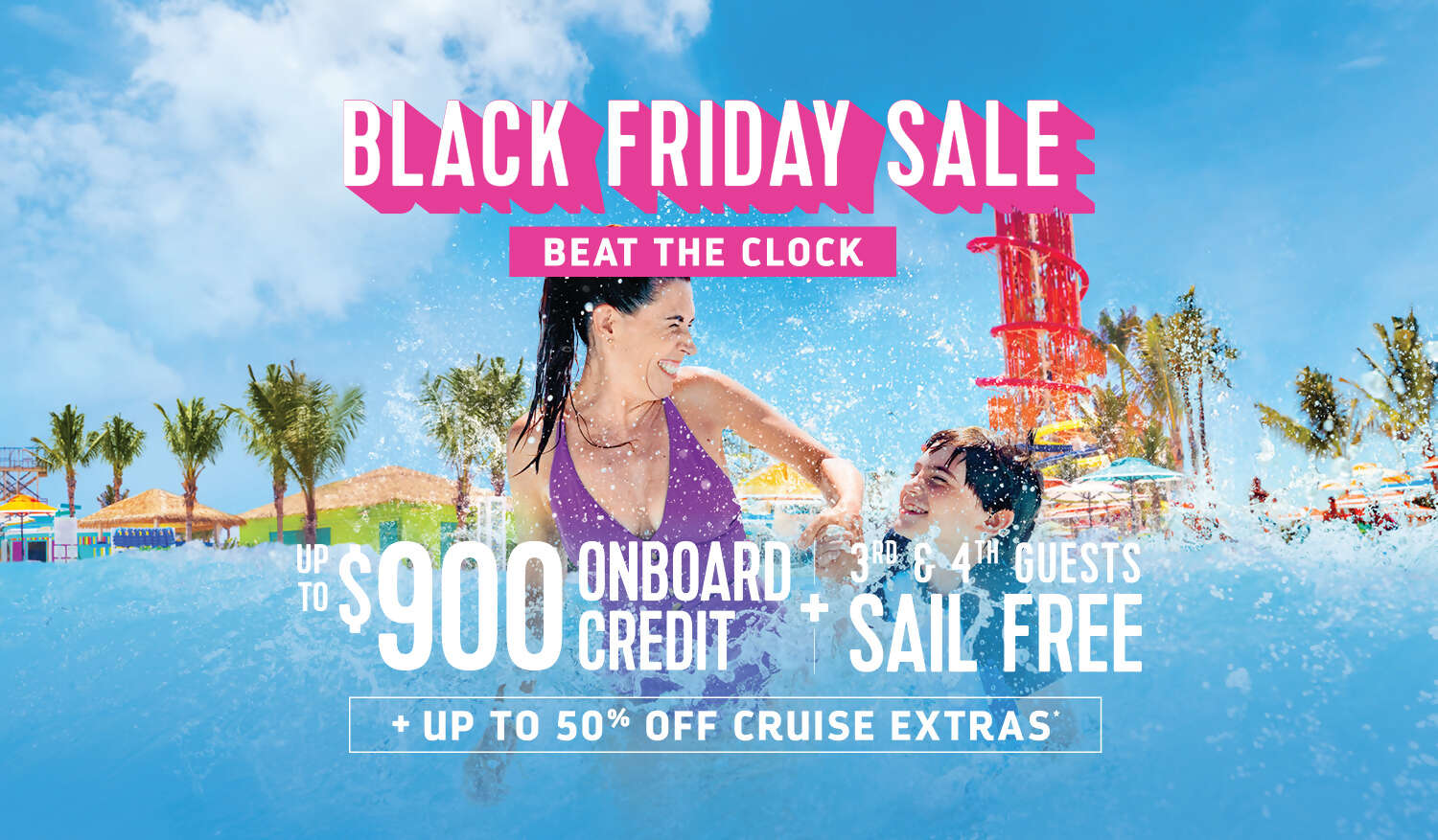 Beat The Clock applies to new, individual, and named group bookings at prevailing rates made November 13, 2025 on sailings departing on or after November 14, 2025 and provides an onboard credit (“OBC”) per stateroom varying by stateroom category booked and sailing length as follows: 5 nights or less, $100 OBC for Interior and Ocean View, $175 OBC for Balconies, and $325 OBC for Suites; 6 nights or longer, $175 OBC for Interior and Ocean View, $250 OBC for Balconies, and $900 OBC for Suites.